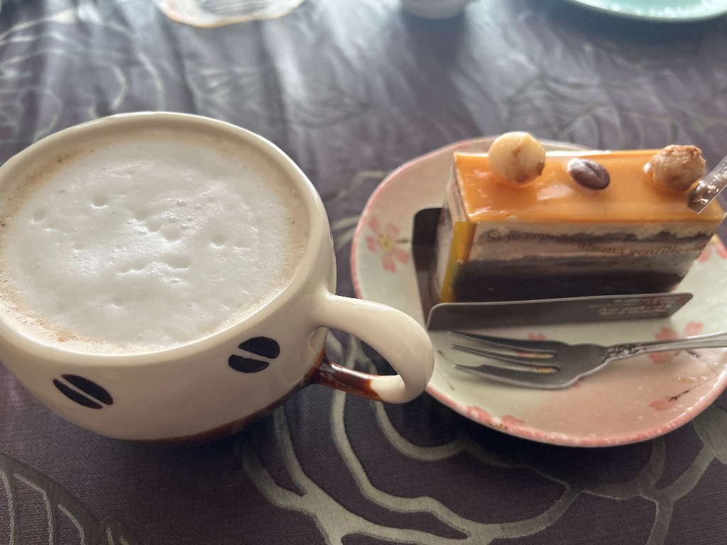 食後のカフェラテとキャラメルケーキ🍰