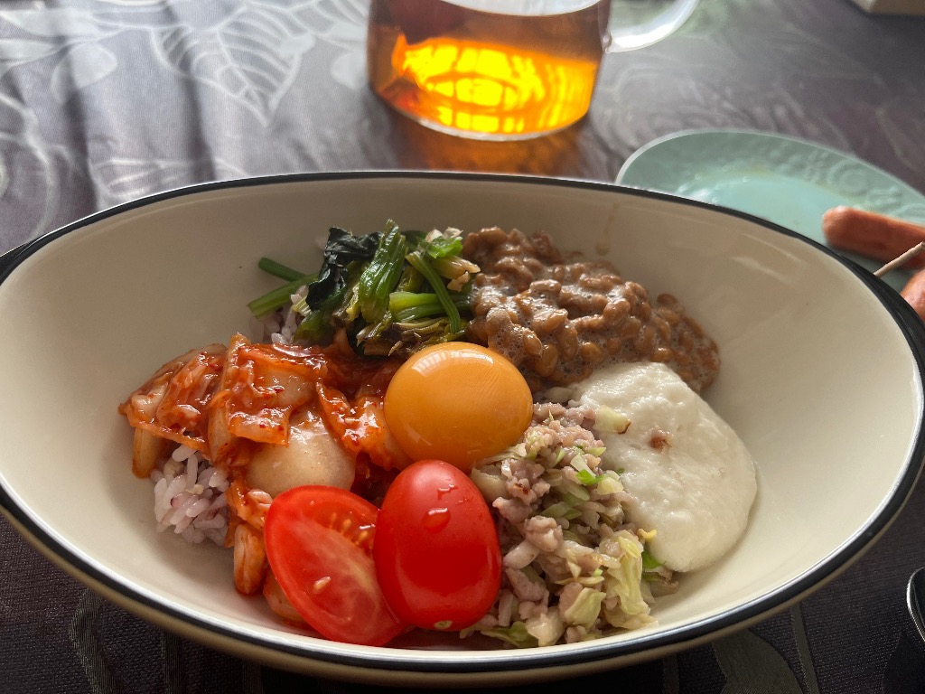 キムチ・納豆・山芋・黄身・昨日の残りの餃子のあん